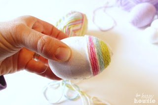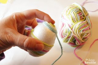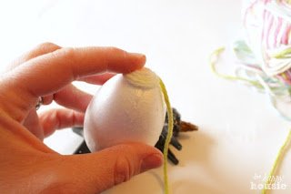 Ezután körbetekerjük a fonállal a tojás feléig, ragasztóval rögzítjük.
